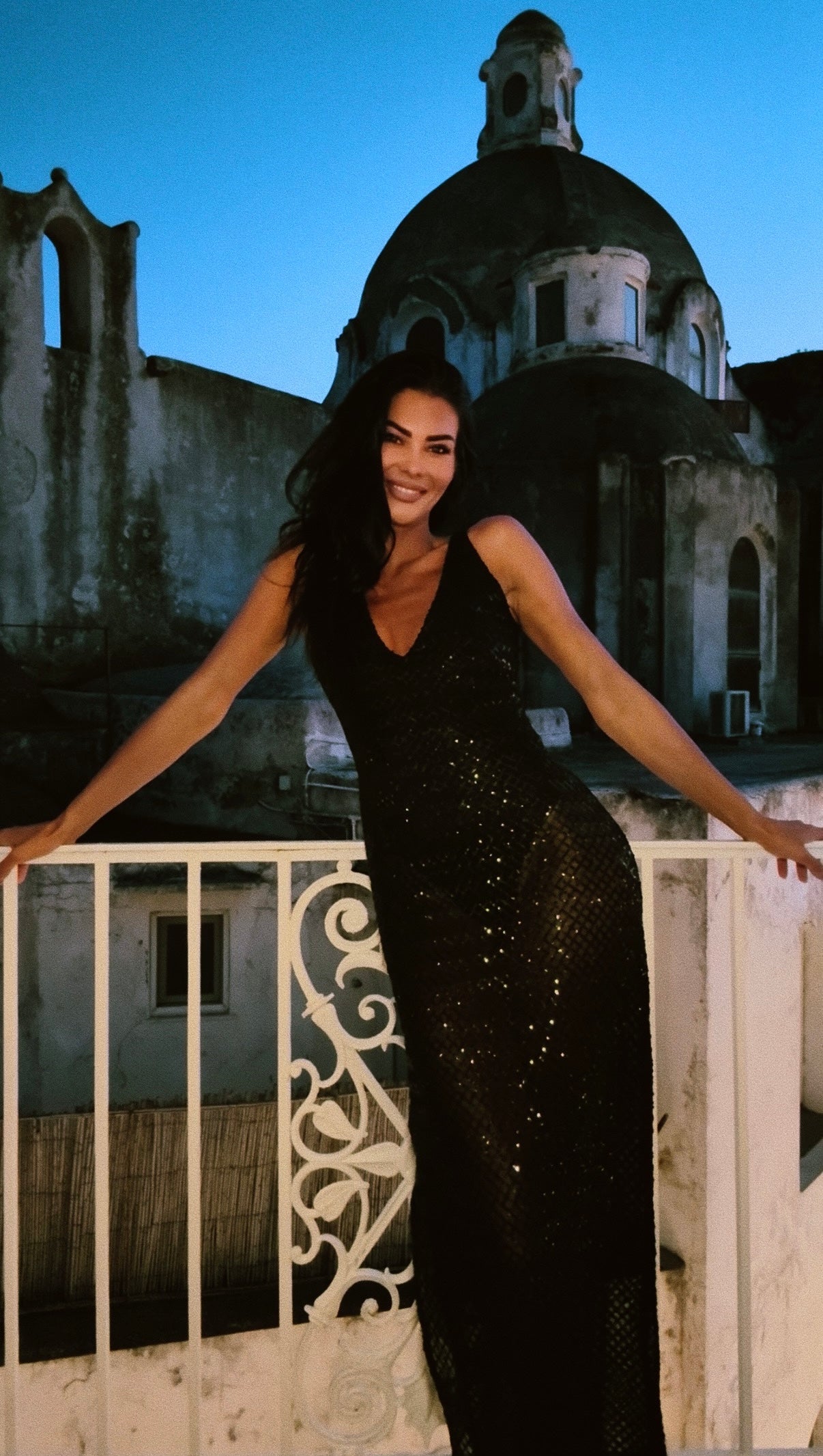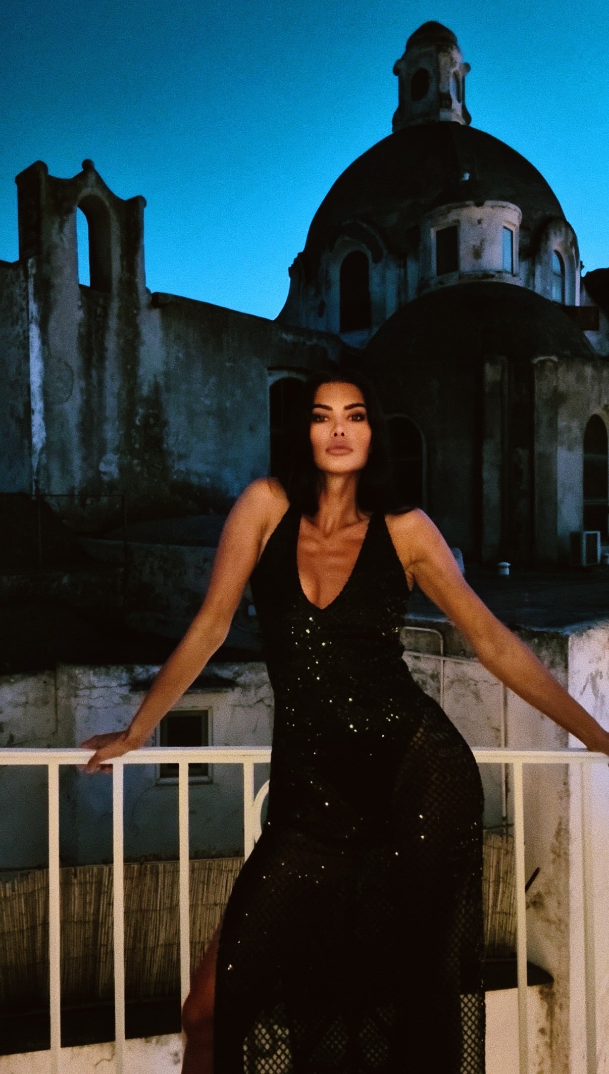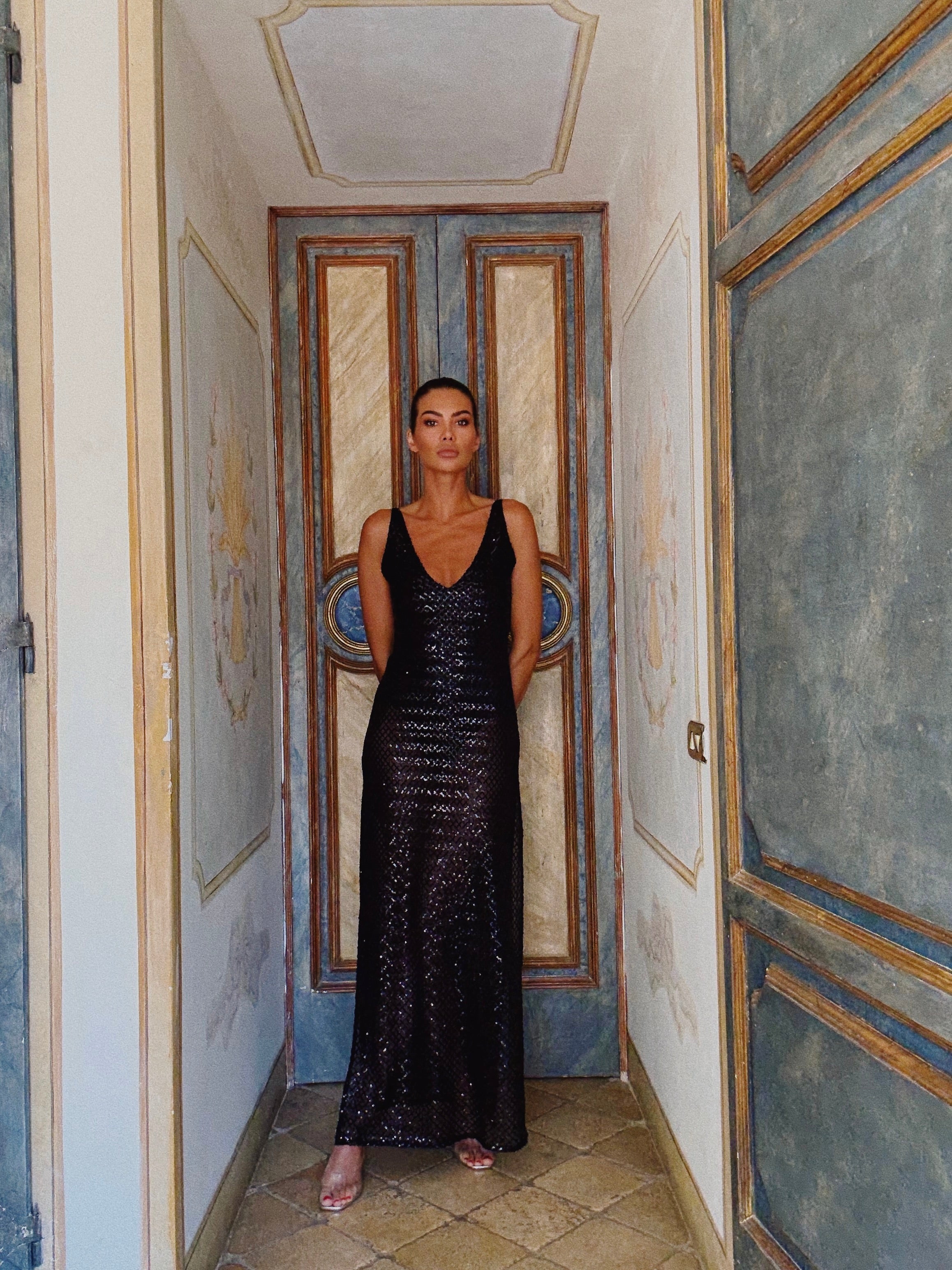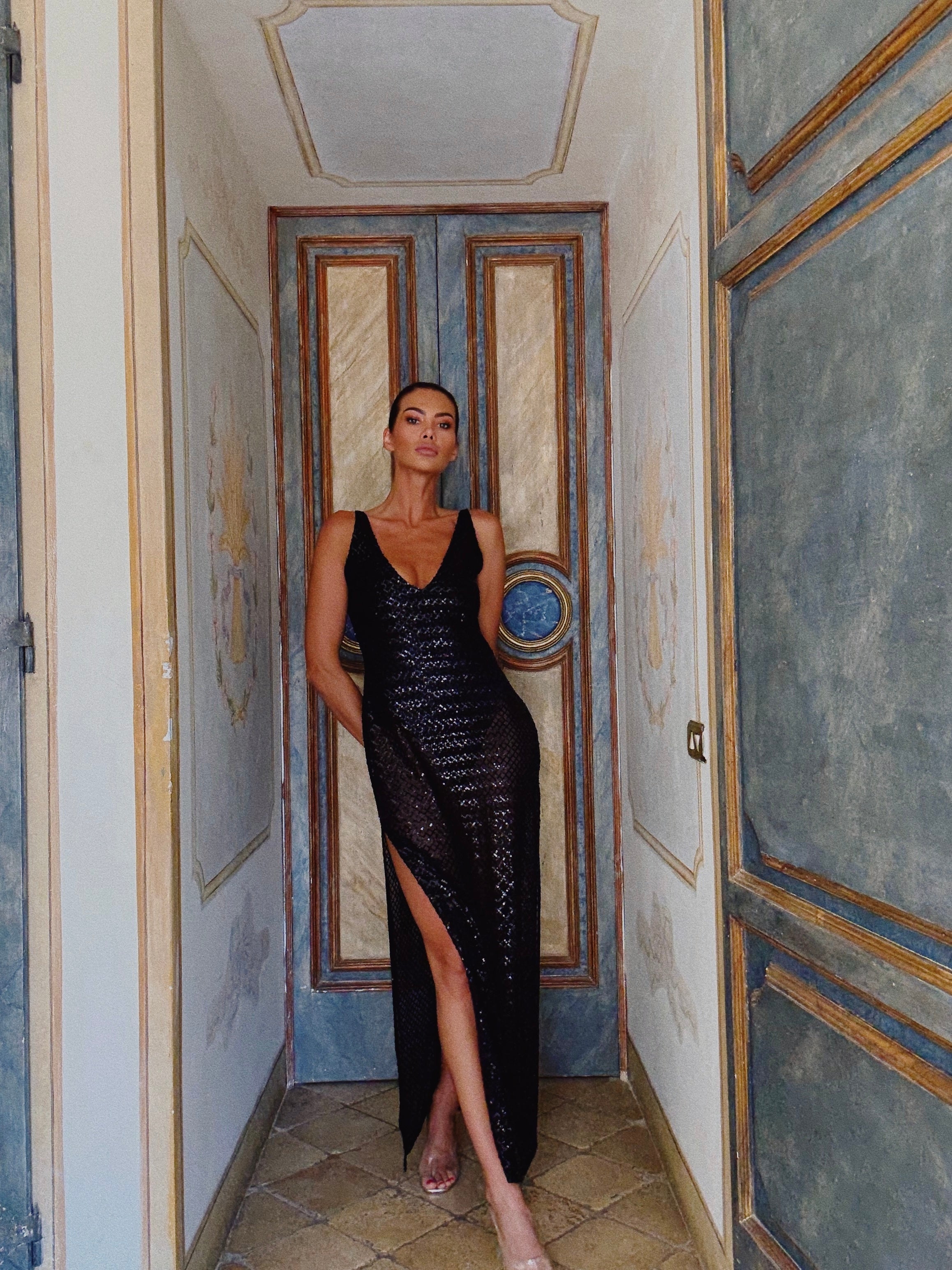 A black sequin gown that catches light like embers in the dark. Sheer panels hint at the body beneath; a deep V neckline and high slit command without force.