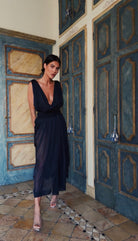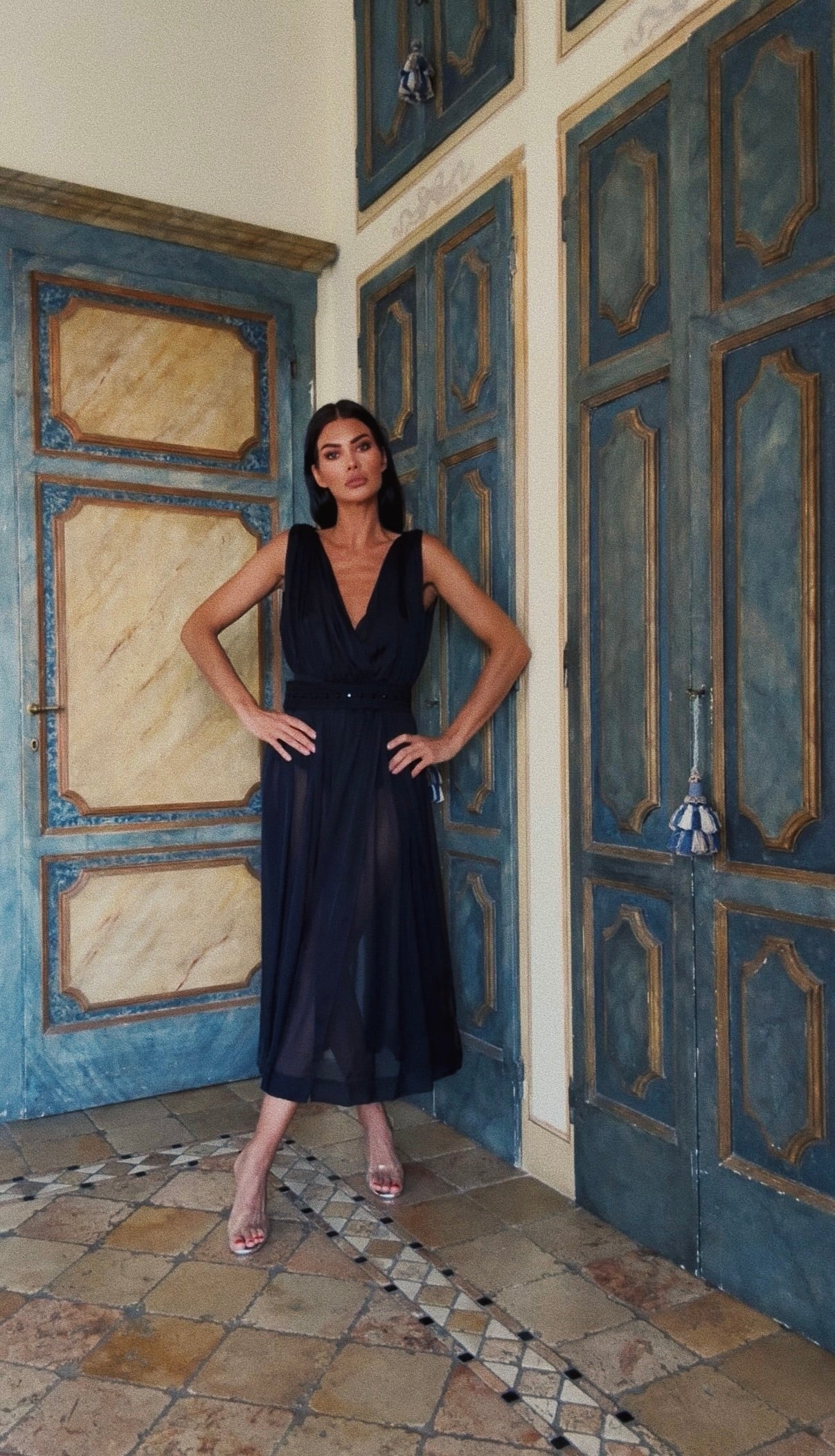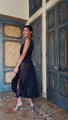 Black sheer silk, goddess-priestess silhouette. Scorpio closes what must be closed; Pisces opens the space for what will come.