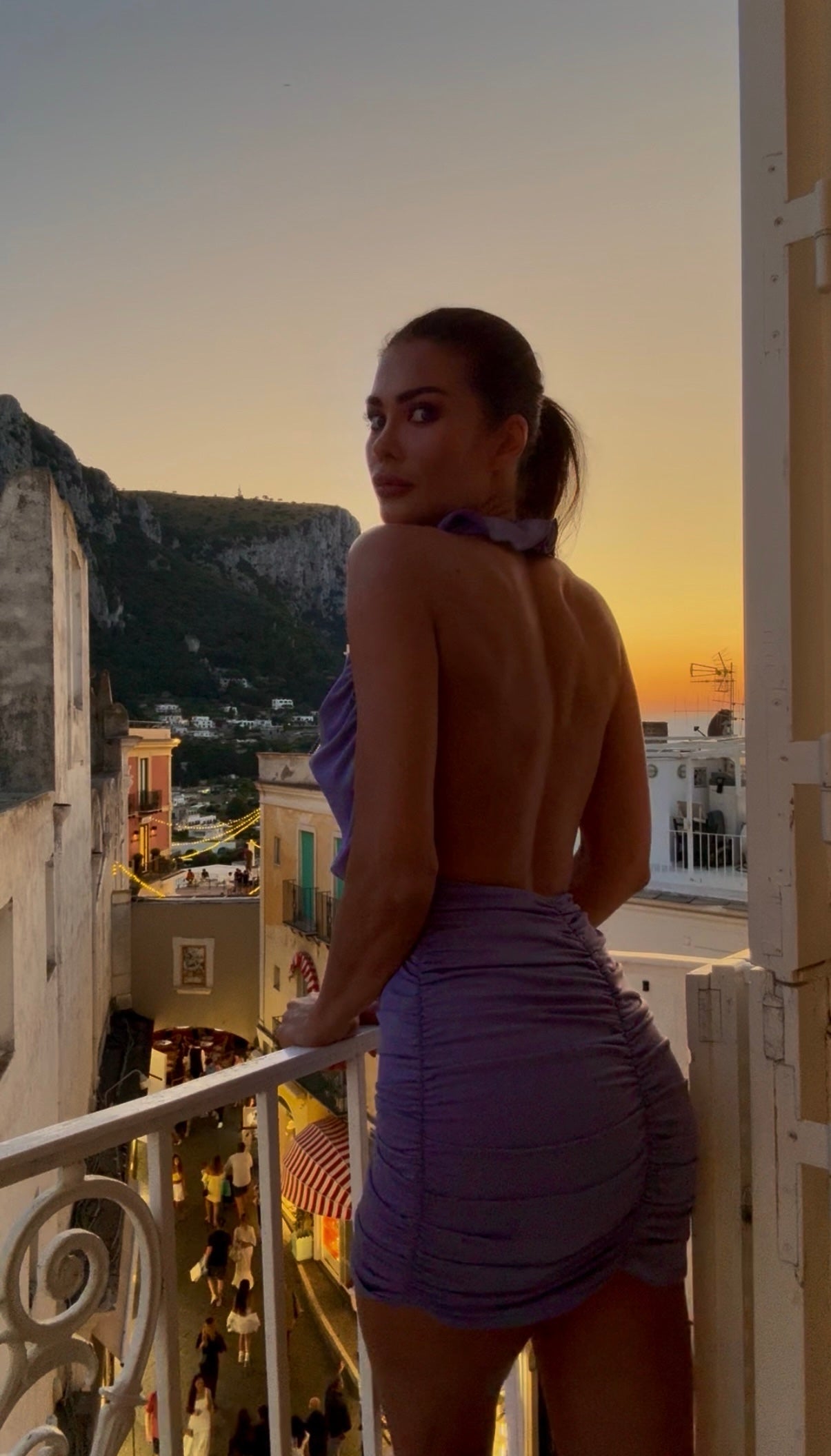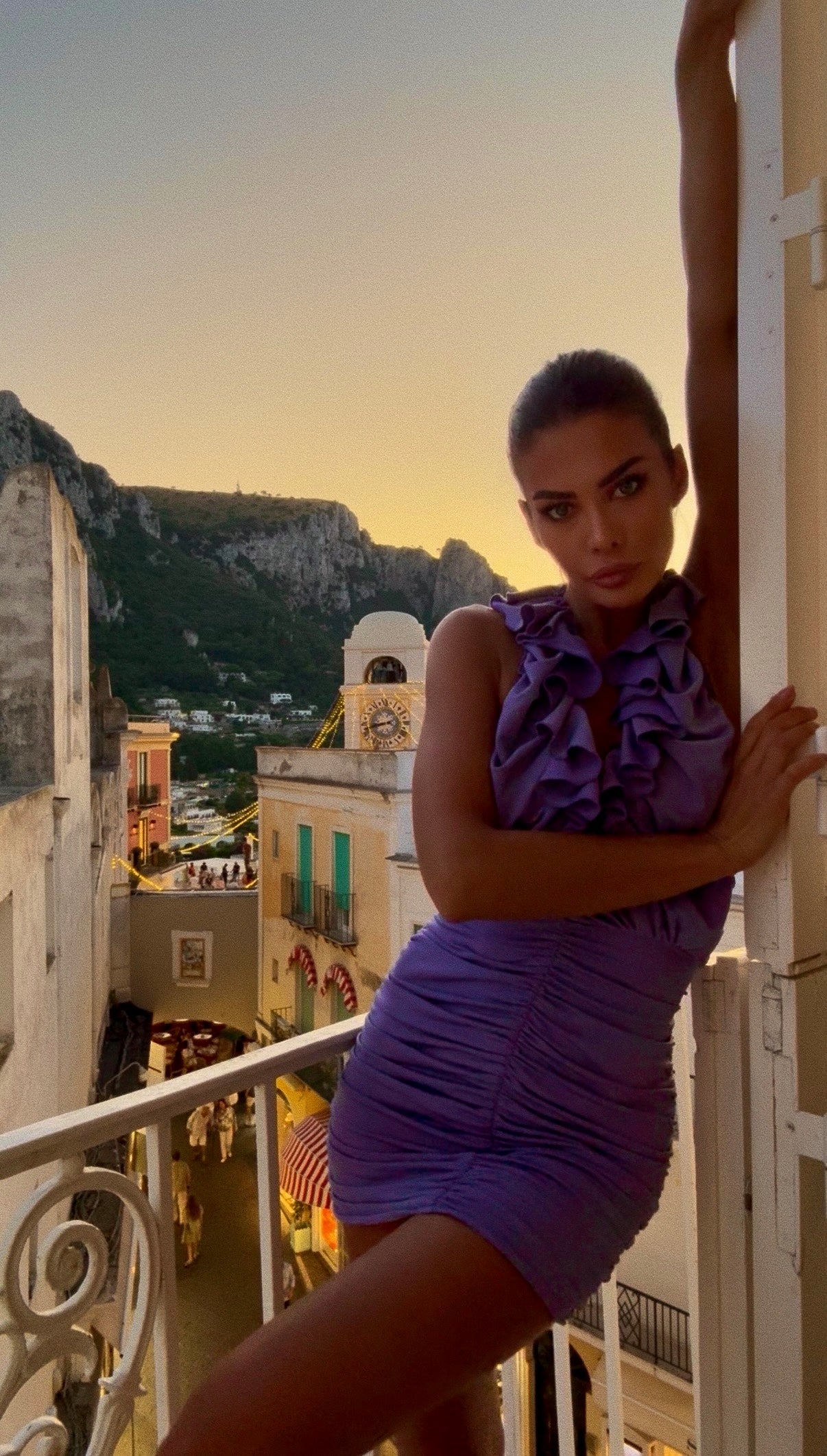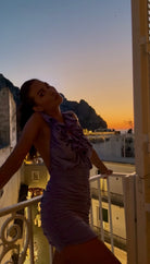 Lavender ruched mini dress with a ruffled neckline — delicate at first glance, but structured in presence. Libra’s balance meets Capricorn’s authority.