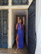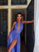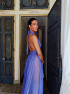 Lavender silk chiffon flows in endless ruffles, whispering across skin like an ancient tide. The open back is not absence but invitation, a glimpse into a hidden world. Under moonlight, each fold becomes a secret; under sunlight, a confession.