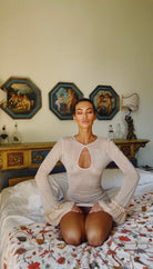 Before dawn claims the sky, there is a moment that belongs only to silence — a fragile breath when the horizon still holds the night, yet the air already tastes of light. Selene’s First Breath captures this moment in golden tulle, sheer as mist over still waters. Silk chiffon sleeves float with invisible breezes, moving like soft tides against the shore.