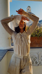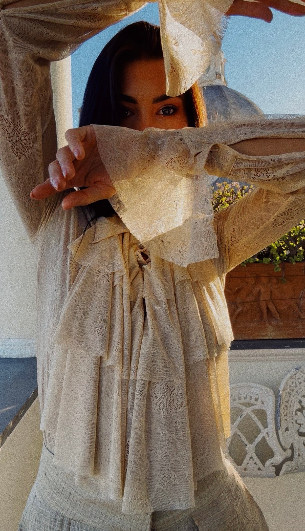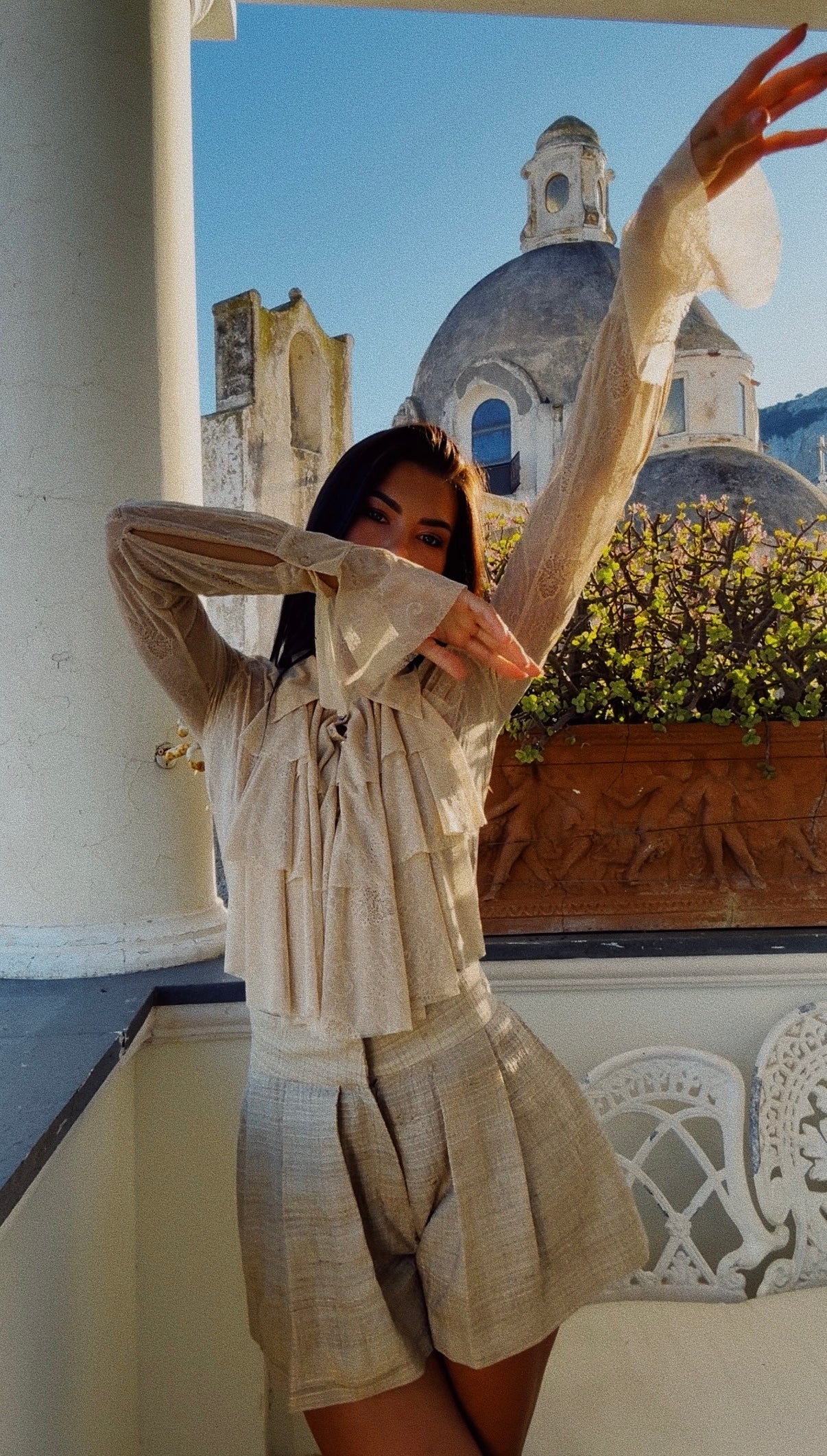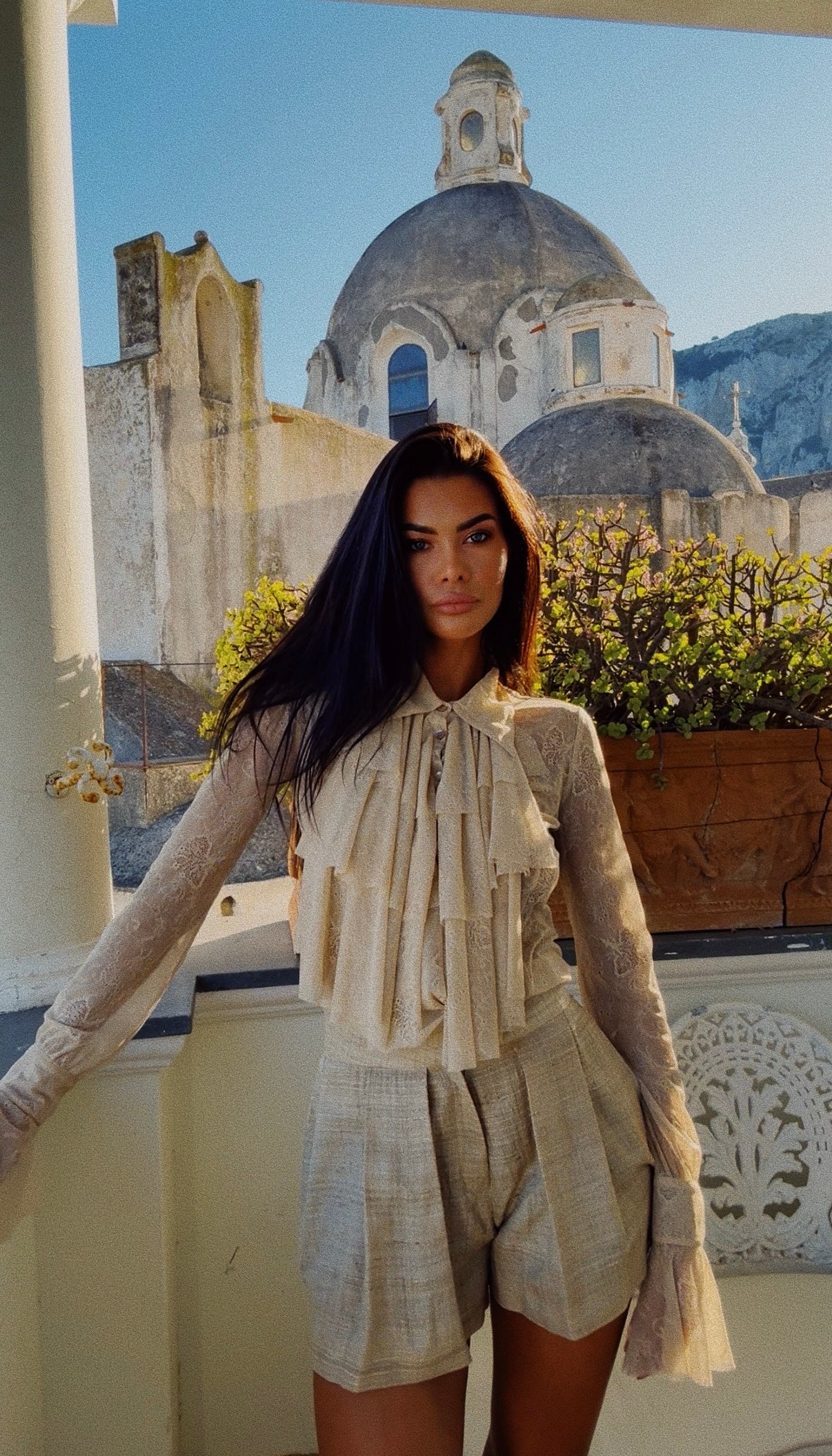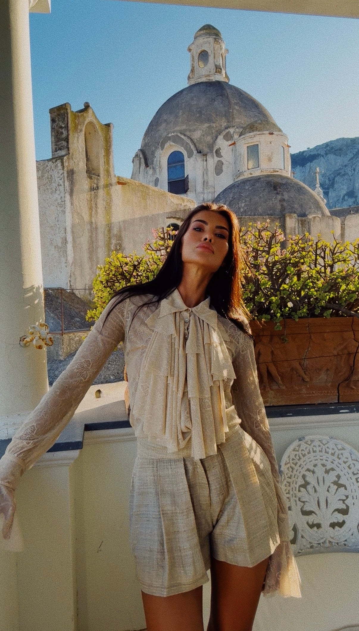 Beige silk shorts and a delicate lace blouse ruffled like waves caught mid-motion. The silhouette is timeless — something that could have existed a century ago or yesterday at sunset on a Capri balcony.