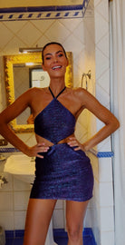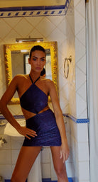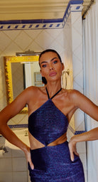 Shimmering navy lurex over silk satin — a dress that feels like the night sky over a restless sea. Sagittarius pushes her forward; Pisces fills her with the dream of where she’s going.
